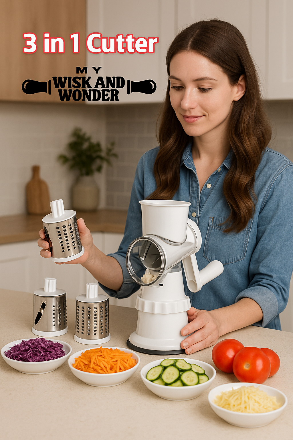 Premium Küchenhobel & Gemüsereibe – Multifunktionaler Dreh-Cutter mit 3 Trommeln für Gemüse, Käse & Obst